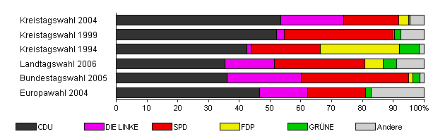 | Kreistagswahl 2004 | 69,4 | 53,4 | 20,5 | 18,0 | 3,1 | 0,6 | 4,3 | |