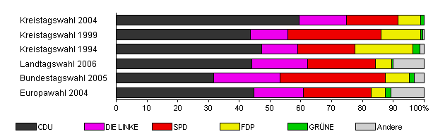 | Kreistagswahl 2004 | 52,3 | 59,6 | 15,4 | 16,8 | 7,2 | 1,1 | x | |