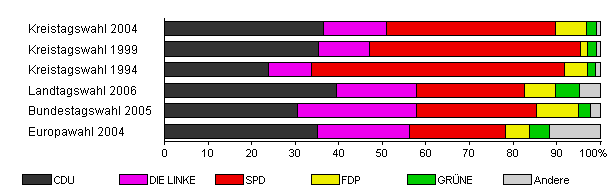 | Kreistagswahl 2004 | 55,3 | 36,6 | 14,3 | 38,8 | 7,2 | 2,2 | 0,8 | |