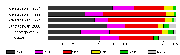 | Kreistagswahl 1999 | 45,9 | 29,0 | 13,8 | 49,1 | 6,6 | 1,1 | 0,4 | |