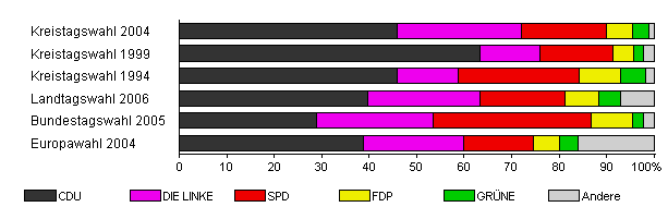 | Kreistagswahl 2004 | 49,5 | 45,9 | 26,1 | 17,9 | 5,5 | 3,5 | 1,1 | |