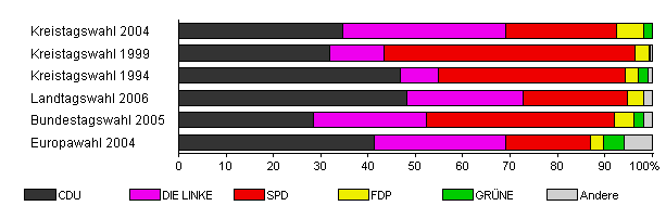 | Kreistagswahl 2004 | 51,6 | 34,7 | 34,5 | 23,4 | 5,8 | 1,7 | x | |