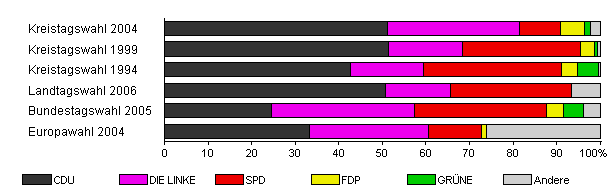 | Kreistagswahl 2004 | 65,7 | 51,3 | 30,3 | 9,4 | 5,4 | 1,4 | 2,2 | |