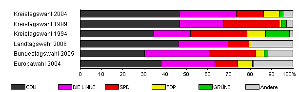 | Kreistagswahl 2004 | 55,6 | 46,7 | 26,8 | 12,7 | 7,5 | 1,7 | 4,6 | |