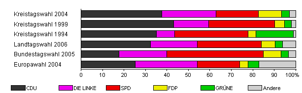 | Kreistagswahl 2004 | 50,3 | 37,7 | 25,1 | 19,8 | 10,9 | 3,6 | 2,9 | |