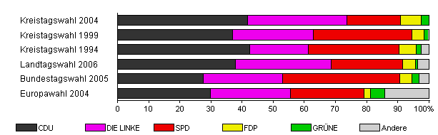 | Kreistagswahl 2004 | 58,2 | 41,8 | 31,9 | 17,3 | 6,6 | 2,4 | x | |