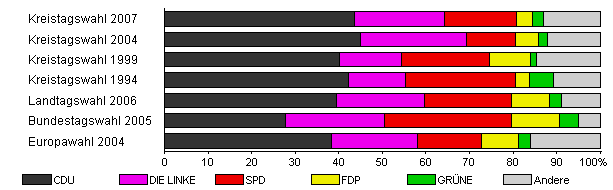 | Kreistagswahl 2007 | 34,6 | 43,5 | 20,8 | 16,6 | 3,6 | 2,6 | 12,9 | |