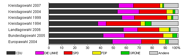 | Kreistagswahl 2007 | 45,1 | 54,0 | 11,4 | 20,4 | 2,2 | 0,9 | 11,1 | |