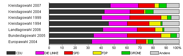 | Kreistagswahl 2007 | 47,3 | 47,1 | 21,6 | 12,3 | 3,4 | 5,9 | 9,8 | |