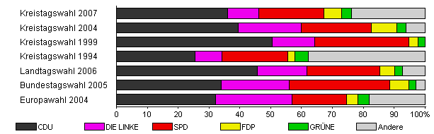 | Kreistagswahl 2007 | 41,8 | 36,1 | 10,0 | 21,2 | 5,7 | 3,3 | 23,6 | |