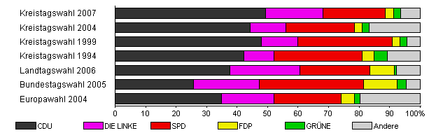 | Kreistagswahl 2007 | 29,4 | 49,3 | 18,8 | 20,4 | 2,9 | 2,2 | 6,3 | |