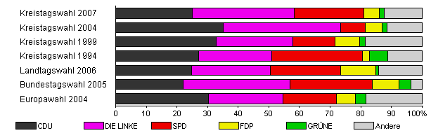 | Kreistagswahl 2007 | 30,0 | 25,1 | 33,2 | 22,8 | 5,0 | 1,5 | 12,4 | |