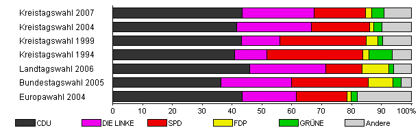 | Kreistagswahl 2007 | 39,4 | 43,4 | 24,2 | 17,0 | 2,2 | 4,1 | 9,1 | |