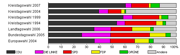 | Kreistagswahl 2007 | 26,3 | 60,3 | 4,6 | 13,7 | 1,5 | 6,9 | 13,0 | |