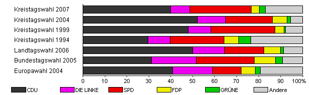 | Kreistagswahl 2007 | 43,3 | 40,0 | 8,6 | 28,1 | 3,7 | 2,6 | 17,1 | |