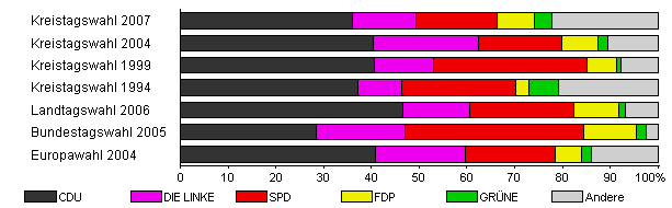 | Kreistagswahl 2007 | 32,9 | 36,1 | 13,2 | 17,0 | 7,9 | 3,7 | 22,0 | |