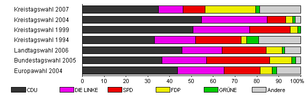 | Kreistagswahl 2007 | 54,0 | 34,9 | 11,3 | 10,1 | 23,2 | 1,7 | 18,7 | |