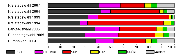 | Kreistagswahl 2007 | 28,2 | 40,3 | 17,2 | 19,0 | 5,2 | 4,6 | 13,8 | |