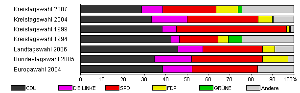 | Kreistagswahl 2004 | 75,7 | 33,3 | 16,7 | 33,3 | 6,6 | 0,5 | 9,6 | |
