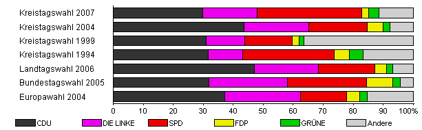 | Kreistagswahl 2007 | 43,4 | 29,8 | 18,2 | 34,8 | 2,4 | 3,3 | 11,5 | |