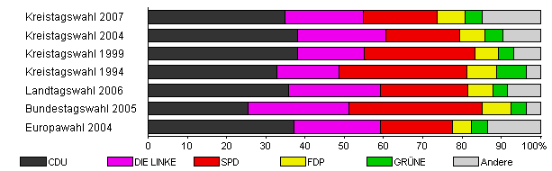 | Kreistagswahl 2007 | 38,5 | 34,9 | 19,9 | 19,0 | 7,0 | 4,3 | 14,9 | |
