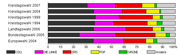 | Kreistagswahl 2007 | 34,7 | 30,7 | 22,0 | 21,3 | 9,8 | 1,6 | 14,6 | |