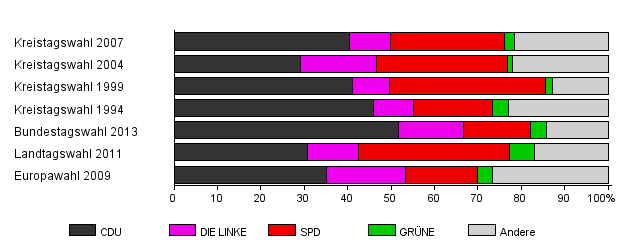 | Kreistagswahl 2007 | 57,3 | 40,4 | 9,4 | 26,4 | 2,3 | 21,6 | |
