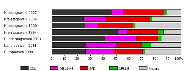| Kreistagswahl 2007 | 34,1 | 46,1 | 9,6 | 31,5 | 1,7 | 11,1 | |