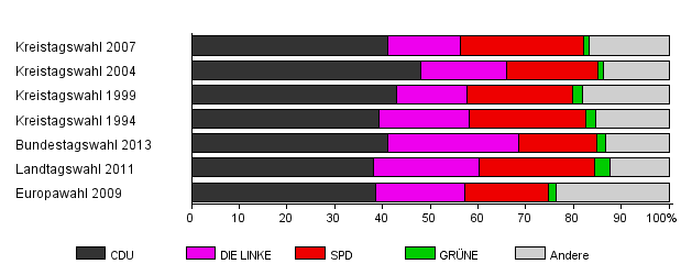 | Kreistagswahl 2007 | 28,0 | 41,1 | 15,1 | 25,8 | 1,2 | 16,7 | |